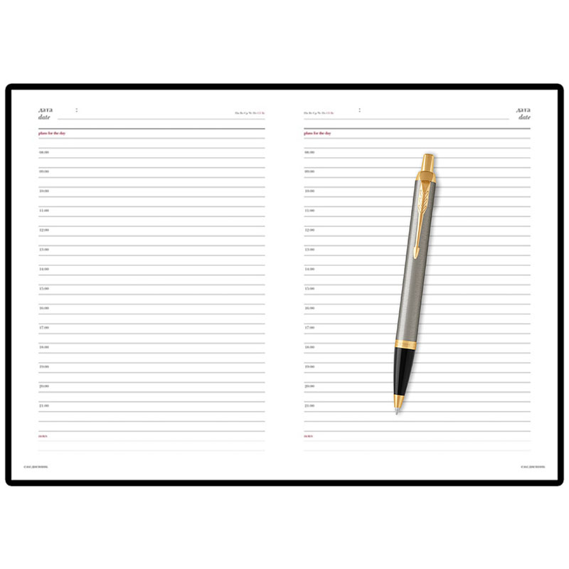 В ежедневнике есть полезная справочная информация и телефонная книга на 18 листов, а также 272 страницы для записи идей, мыслей и составления рабочих планов. Для изготовления страниц используется качественный белый офсет повышенной плотности (70 г/кв м) с золотым срезом, который производится в Японии и подходит для всех видов чернил. Разметка блока с указанием времени позволяет планировать дела с точностью до 1 часа.