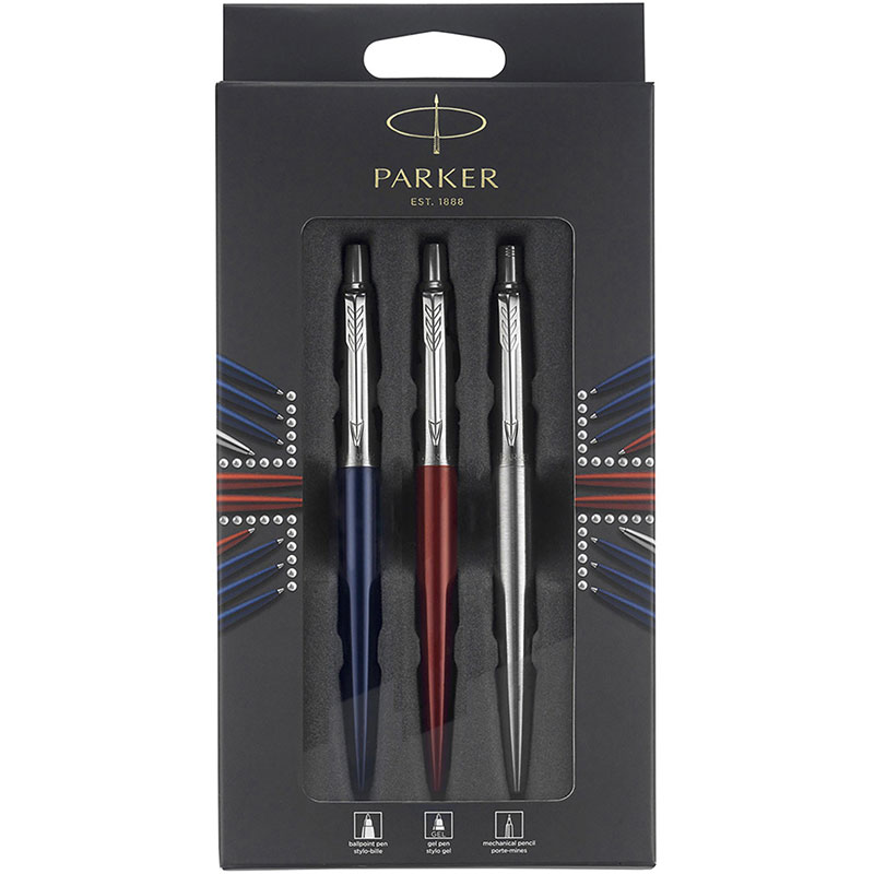 Набор Parker Jotter London Trio: гелевая ручка Red CT + шариковая ручка Blue CT + карандаш Stainless Steel CT и ежедневника триколор в Уфе